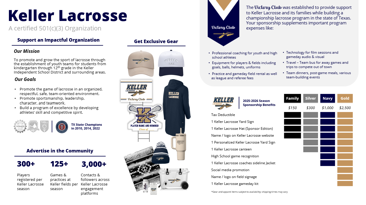In addition, the Victory Club was established to provide support to Keller Lacrosse and its families while building a championship lacrosse program in the state of Texas. Your sponsorship supplements important program expenses like: